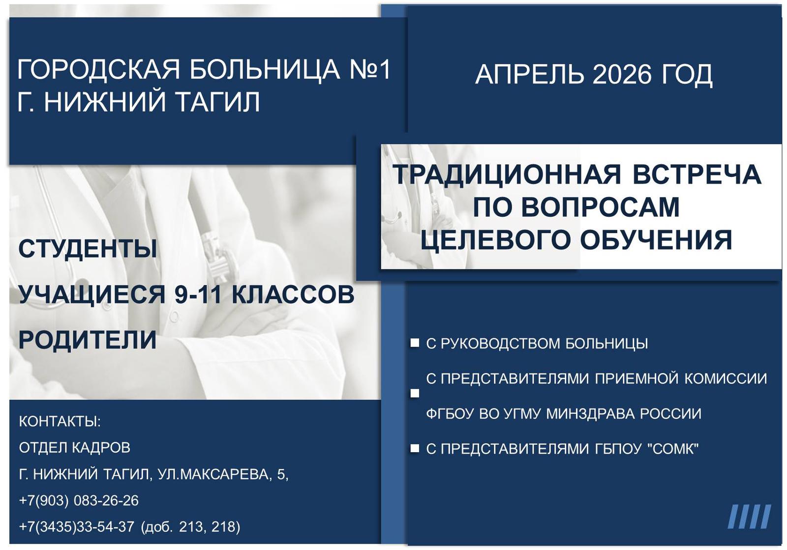 Доводим до Вашего сведения информацию о том, что документы необходимые для оформления пакета документов на целевое обучение подается в отдел кадров учреждения расположенного на первом этаже административного корпуса по адресу г.Н.Тагил, ул. Максарева д.5.
